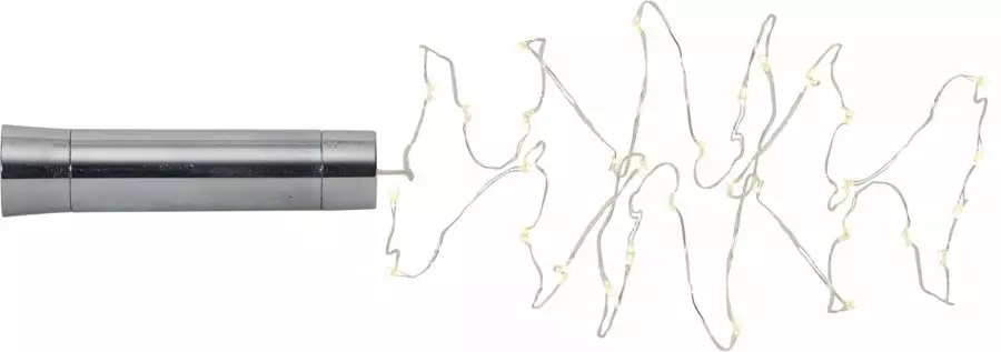 Design: Paristokäyttöinen valosarja 40 lämpimän valkoisella Dew Drop LED-lampulla hopeanvärisessä kaapelissa. Pullonkorkin muotoinen paristokotelo.