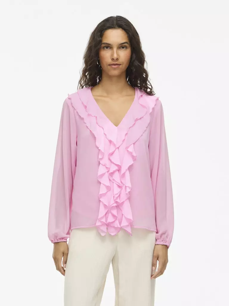 #vilane #paita #röyhelöinen #pitkähihainen #kierrätettypolyesteri #vaaleanpunainen #bonbon #vastuullinenmuoti #tyylikäs #ekologinen #arki #juhla #naistenmuoti