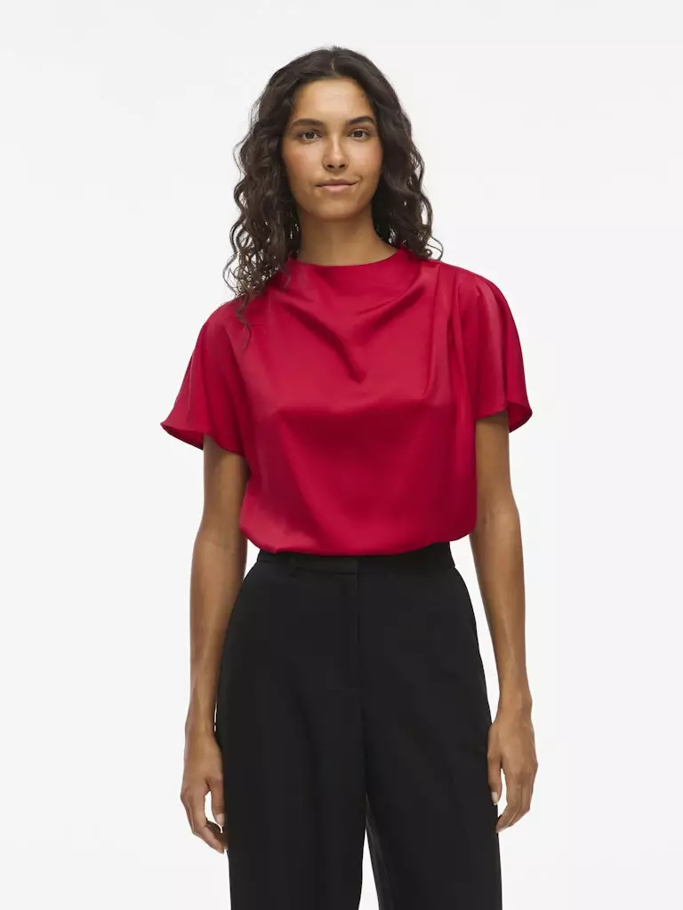 Tämän näyttävän punaisen topin muotoilu tekee siitä täydellisen keskipisteen asukokonaisuudelle.