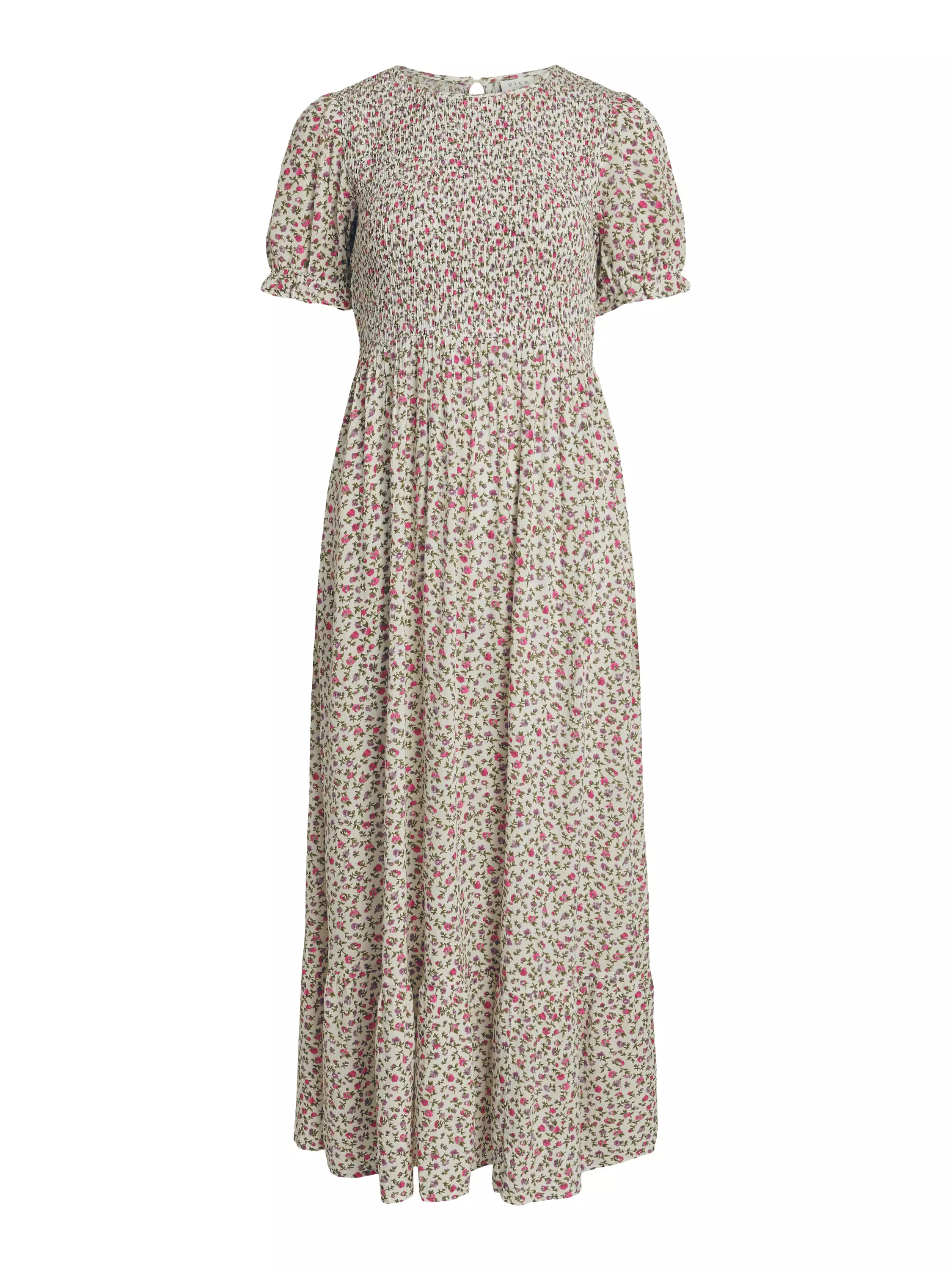 Suloisen printin ja ilmavan materiaalin yhdistelmä tekee VILA Greis -mekosta täydellisen valinnan kesäpäiviin! Tämä pitkä, lyhythihainen mekko on valmistettu kevyestä ja ihanan pehmeästä 100 % LENZING™ ECOVERO™ viskoosista, joka laskeutuu kauniisti ja tuntuu miellyttävältä ihoa vasten. Mekossa on klassinen pyöreä kaula-aukko ja hurmaava, smokkirypytetty yläosa, joka luo imartelevan siluetin. Vyötäröllä oleva leikkaus ja runsas A-linjainen helma tuovat mekkoon liikettä ja naisellisuutta. Kaunis monivärinen printti "sangria sunset" -sävyissä peittää koko mekon pinnan, tehden siitä katseenvangitsijan.