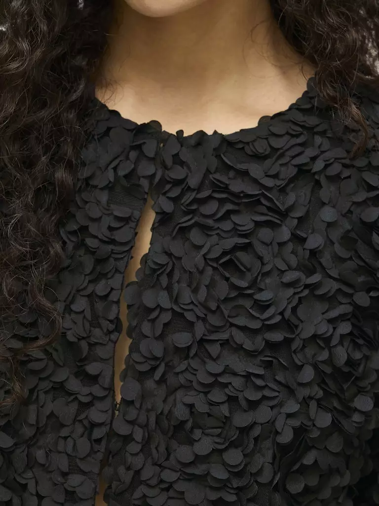 Elegantti design: Koristeelliset yksityiskohdat ja hienostunut leikkaus luovat neuleeseen ainutlaatuisen ja juhlavan ilmeen.