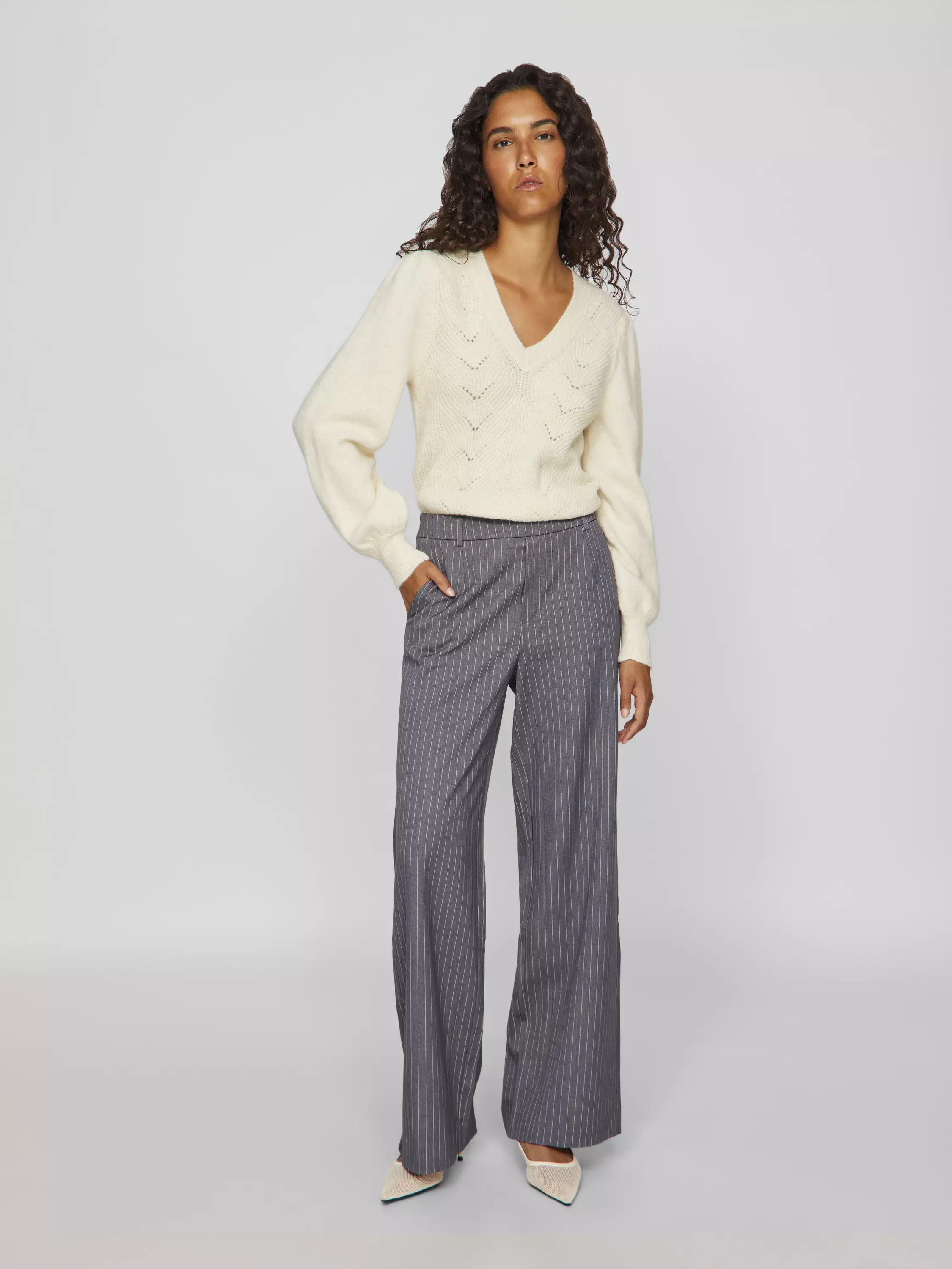 Liituraitaiset housut joissa korkea vyötärö sekä pitkät leveät lahkeet. Housuissa on takana joustava kuminauhavyötärö, taskut sivuilla, koristetaskut takana sekä vyönlenkit. Kauniisti laskeutuvat housut on valmistettu miellyttävän pehmeästä materiaalista.