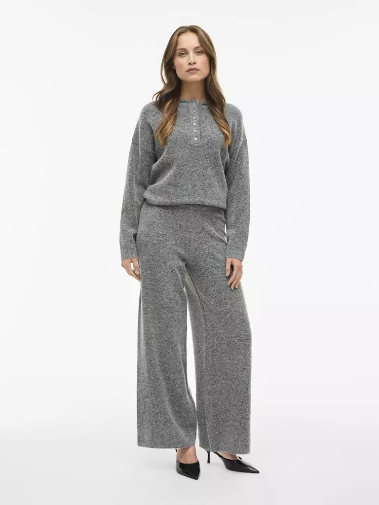 Tuote: VILA VICASTI Neulekankaiset Housut Avainsanat: VILA VICASTI housut, neulekankaiset housut, wide fit housut, kierrätyspolyesteri villa, harmaat neulehousut, kuminauhavyötärö.