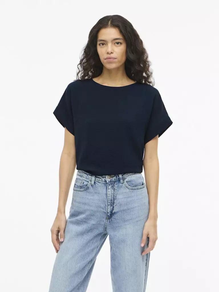 Vila Vijosa on täydellinen valinta sinulle, joka etsit kevyttä, tyylikästä ja ympäristötietoisesti valmistettua yläosaa. Tämä lyhythihainen pusero on vaatekaapin todellinen moniottelija: sen pelkistetty muotoilu ja klassinen tummansininen sävy (Navy Blazer) tekevät siitä hienostuneen vaihtoehdon niin rentoon arkityyliin kuin huoliteltuun työpukeutumiseenkin.