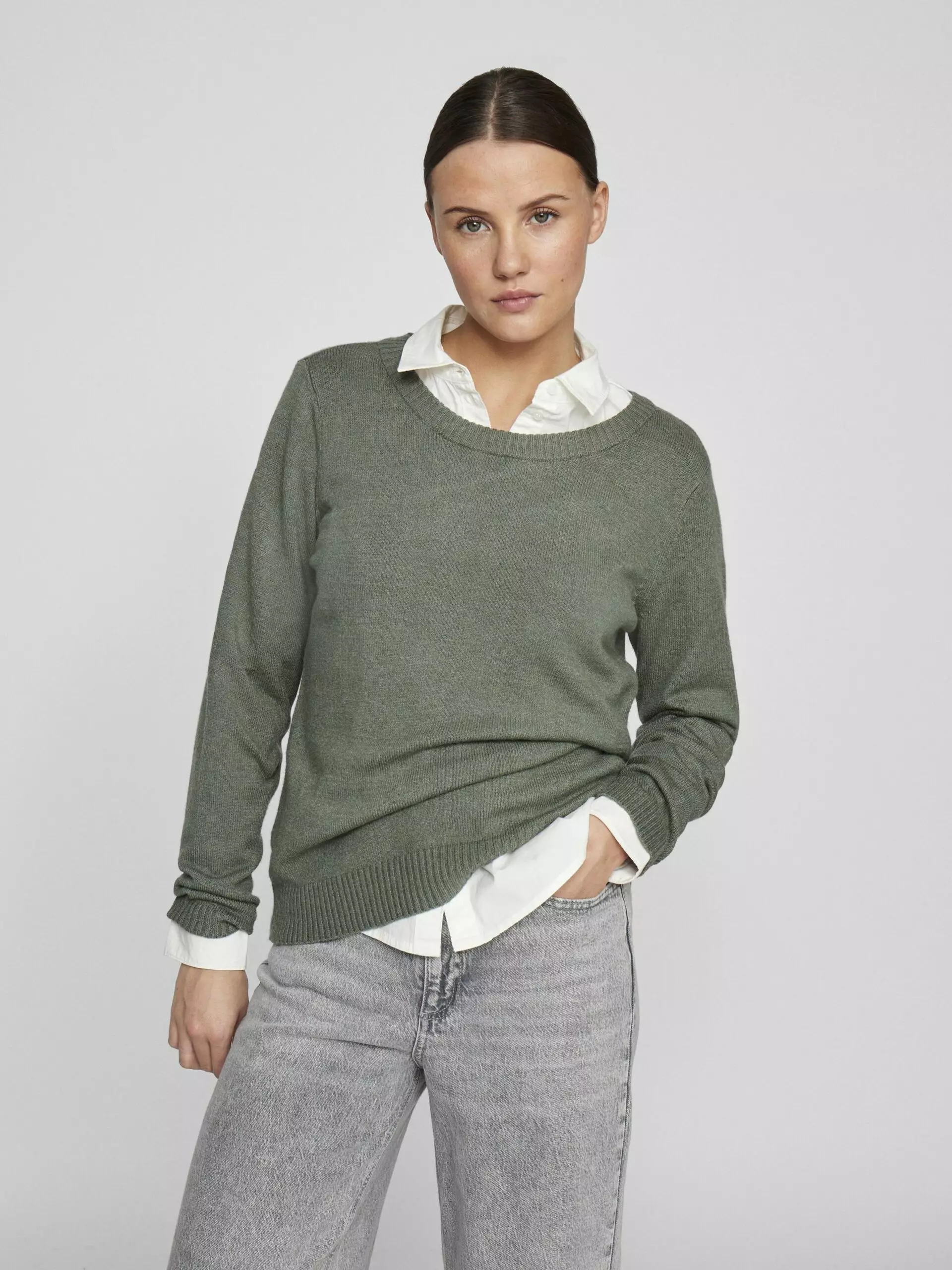 Tuote: VILA VIRIL Pyöreäpäänteinen Neulepaita Avainsanat: VILA VIRIL neulepaita, pyöreäpäänteinen neule, vihreä neulepusero, Laurel Wreath, joustava neule, resoridetaljit.